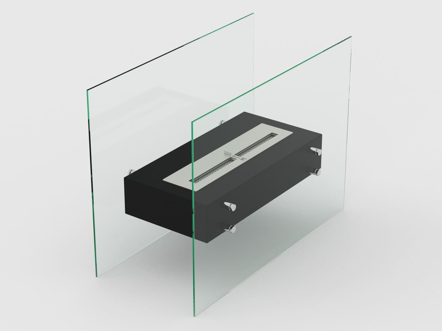 Представляет собой цельный металлический каркас с топливным блоком Lux Fire 500 М, закрепленный на 8 дистанционных держателях к защитным стеклам, создавая эффект «воздушности».